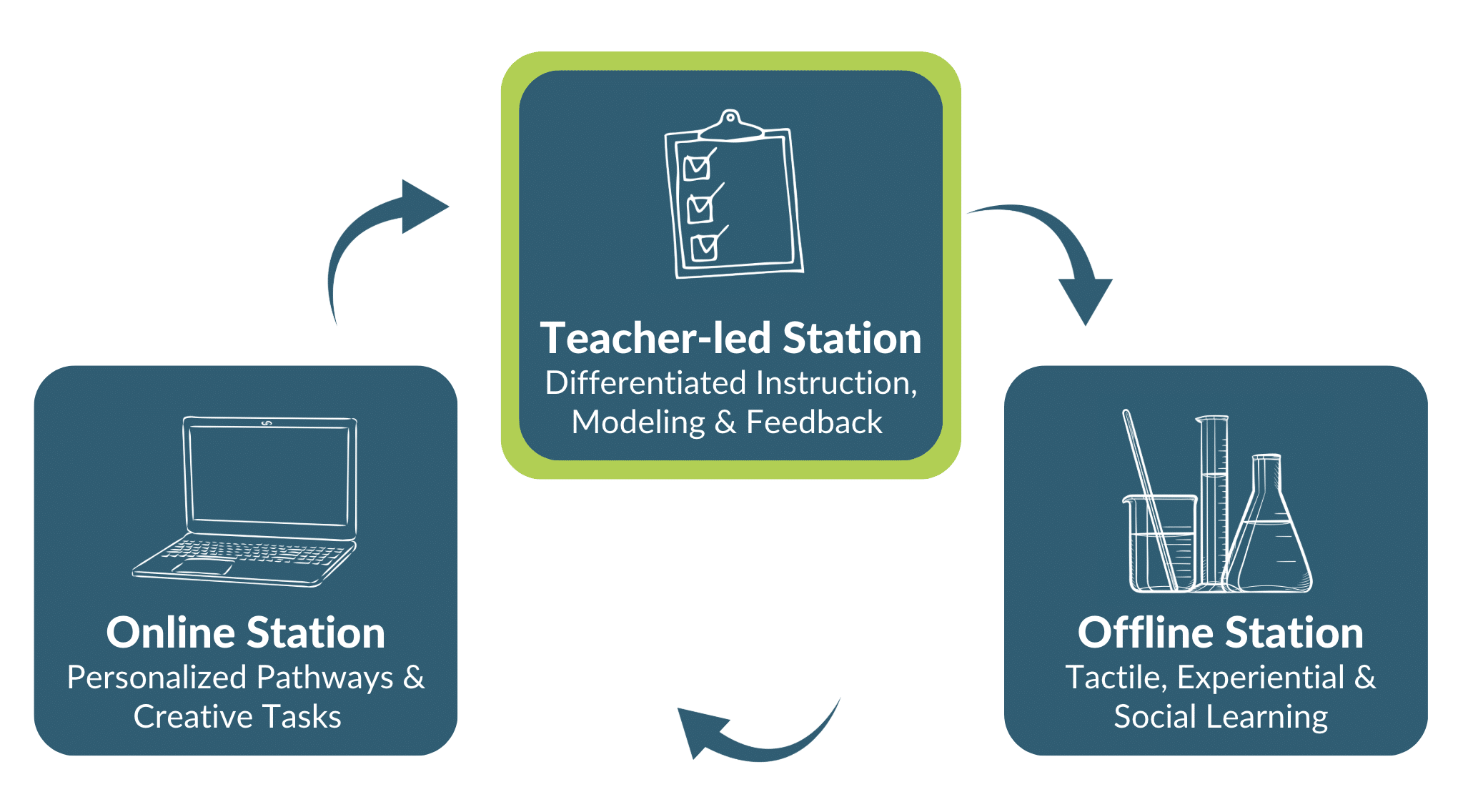 Today’s classrooms are beautifully diverse. Students bring a wide range of skills, abilities, language proficiencies, learning preferences, and interests with them into the learning environment. While this diversity is a strength, it also makes whole-group, teacher-led, one-size-fits-all instruction problematic. Too often, teachers are given a curriculum that is designed this way, and as a result, they feel pressured to “teach to the middle.” This inevitably leaves some students behind, feeling lost, while others are left without the challenge and rigor they need to remain engaged. The teacher-led station in the station rotation model addresses this challenge. When a concept, skill, or process is particularly challenging or difficult, teachers can use this station to differentiate Tier 1 instruction, making it more effective and more inclusive than traditional whole-group instruction.