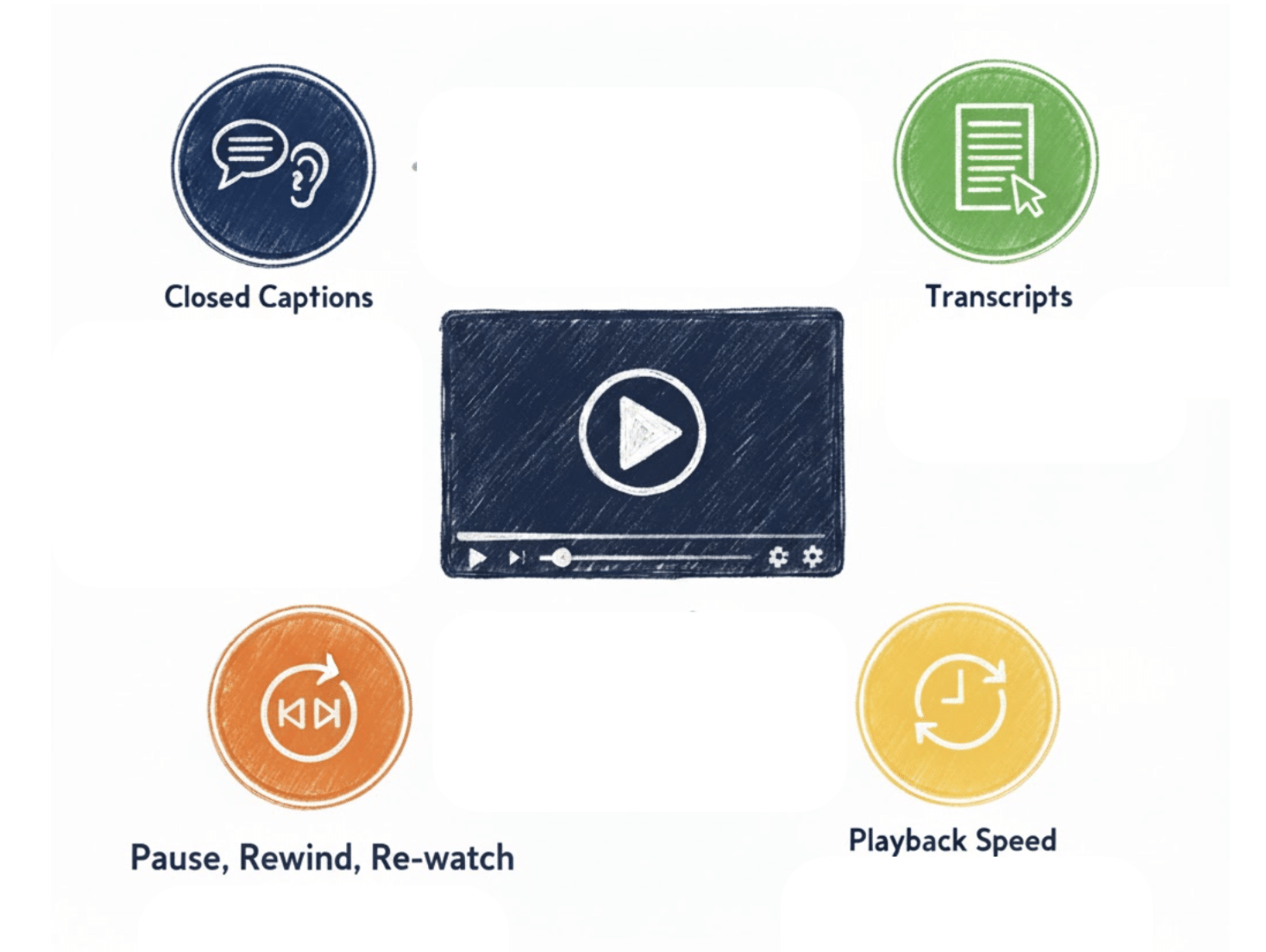 I highlight that videos remove some of these obstacles. Unlike live instruction, videos offer built-in accessibility features. Students can adjust the playback speed, turn on closed captions, and pause, rewind, and rewatch the video. All of these features give students greater control over how they engage with new information, making it easier to access.