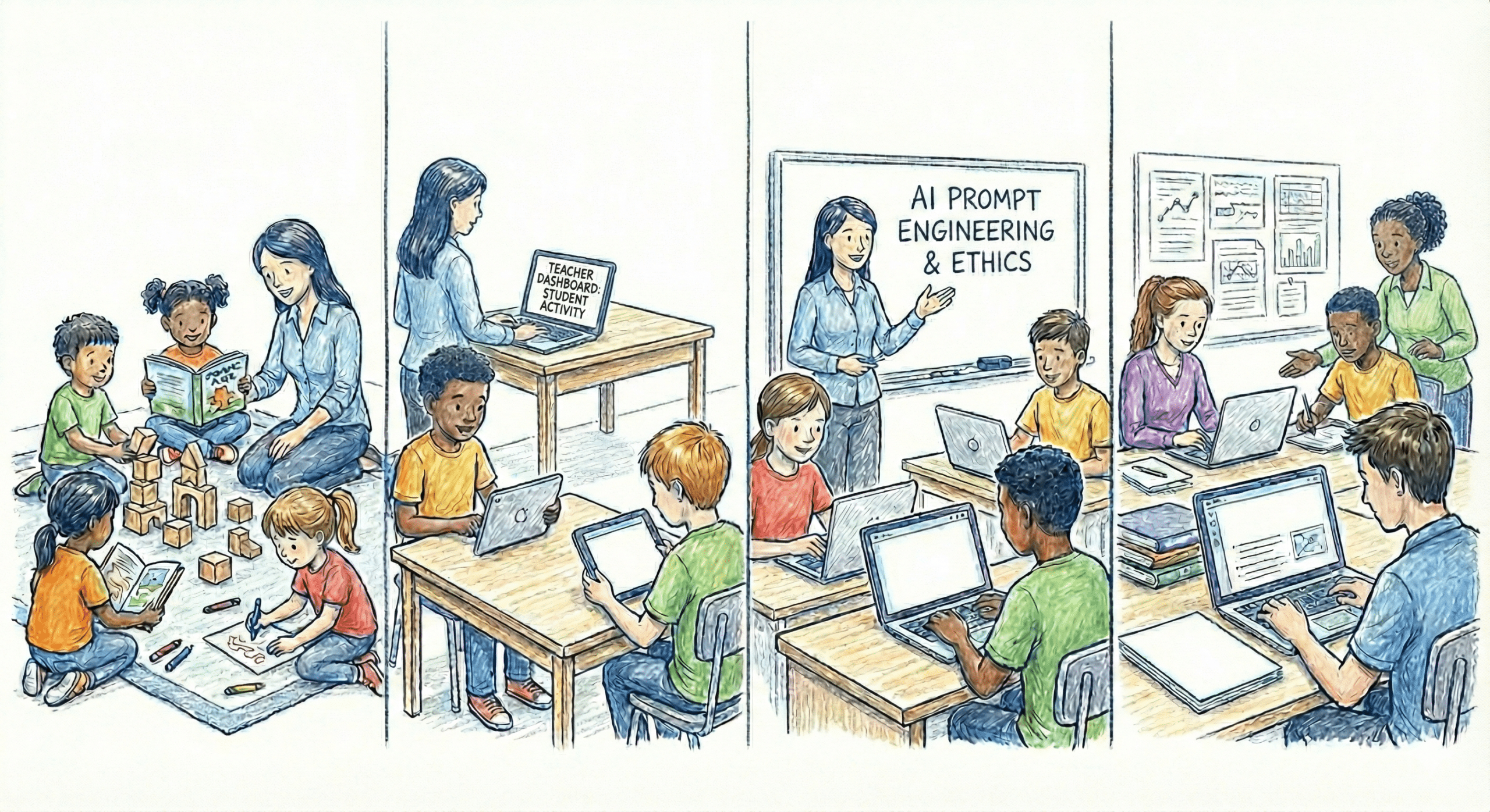 While some AI implementation frameworks combine K-2, this guide intentionally provides a longer runway for foundational skills. Kindergarten through third grade focuses on foundational skill-building without direct use of AI. Young students are learning to communicate, reflect, and solve problems. These skills are directly transferable to later work with AI. Research on cognitive development, screen time, and early learning suggests that introducing online tools too early can undermine this foundational work. I recommend delaying the introduction of online AI tools until these foundational skills are firmly in place. By prioritizing skill development first, we create the conditions for students to engage with AI more confidently and thoughtfully.