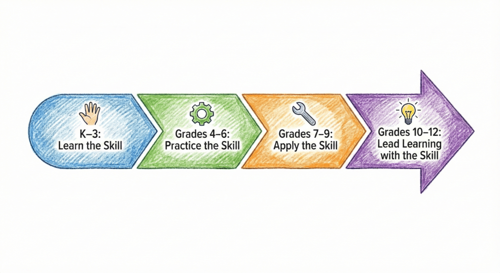 Across all grade levels, the focus remains consistent: skills first, tools second.