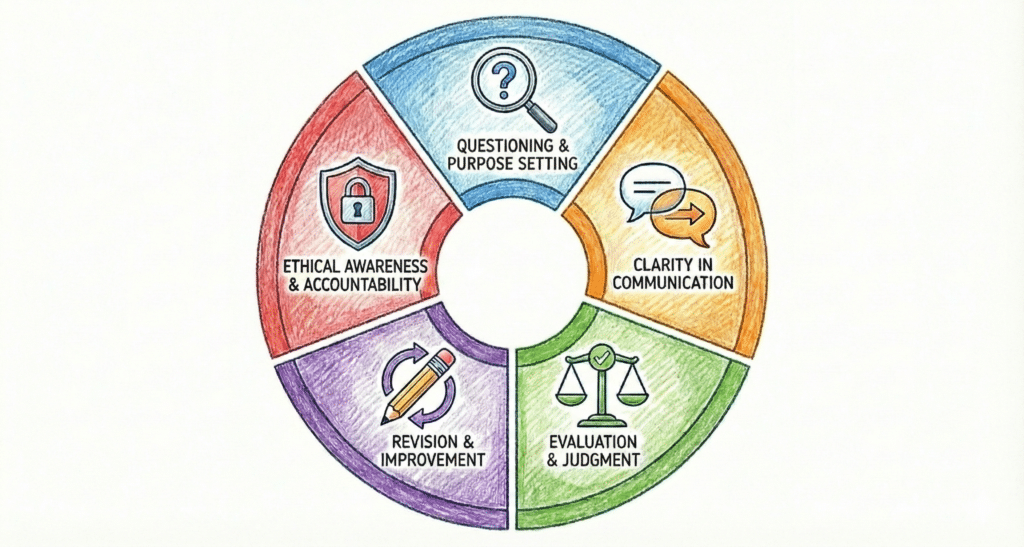 Students develop the ability to express their thinking clearly so others understand their ideas, questions, and intentions. Clear communication improves understanding, feedback, and collaboration. As students interact with others and AI, they learn that precise language leads to more useful responses and better outcomes.