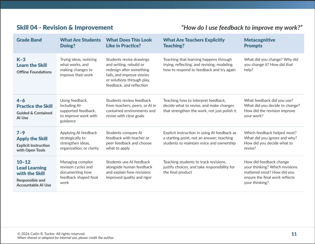 Like the other foundational skills in this series, revision and improvement develop over time through explicit instruction, practice, and reflection. When educators prioritize this skill, students learn that quality is a product of iteration and their work can continually improve.