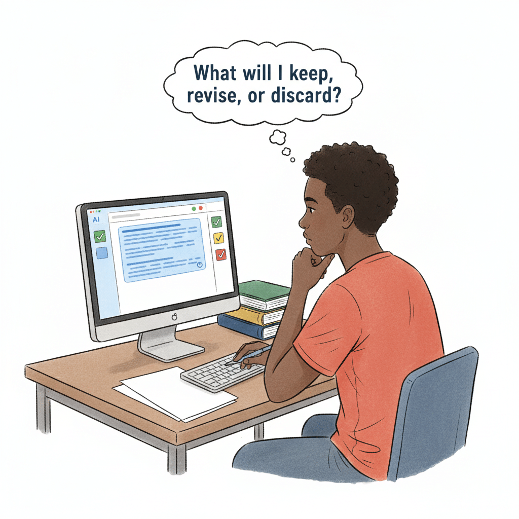 Teachers provide explicit instruction on using AI feedback as a starting point rather than an answer. They model how to evaluate suggestions against assignment criteria and learning goals. They also encourage students to reject revisions that weaken reasoning, oversimplify ideas, do not align with the assignment’s criteria, or shift their meaning.