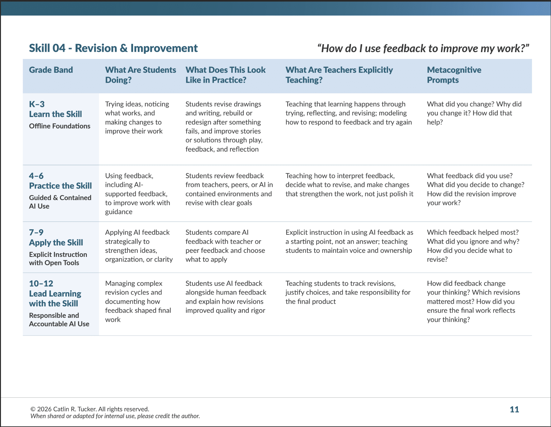 Across grade levels, revision and improvement center on a consistent set of questions: How can I make this stronger? What feedback will actually move my work forward? As students progress through K–12, they shift from simply trying again and noticing what works to strategically managing complex revision cycles and justifying their decisions.